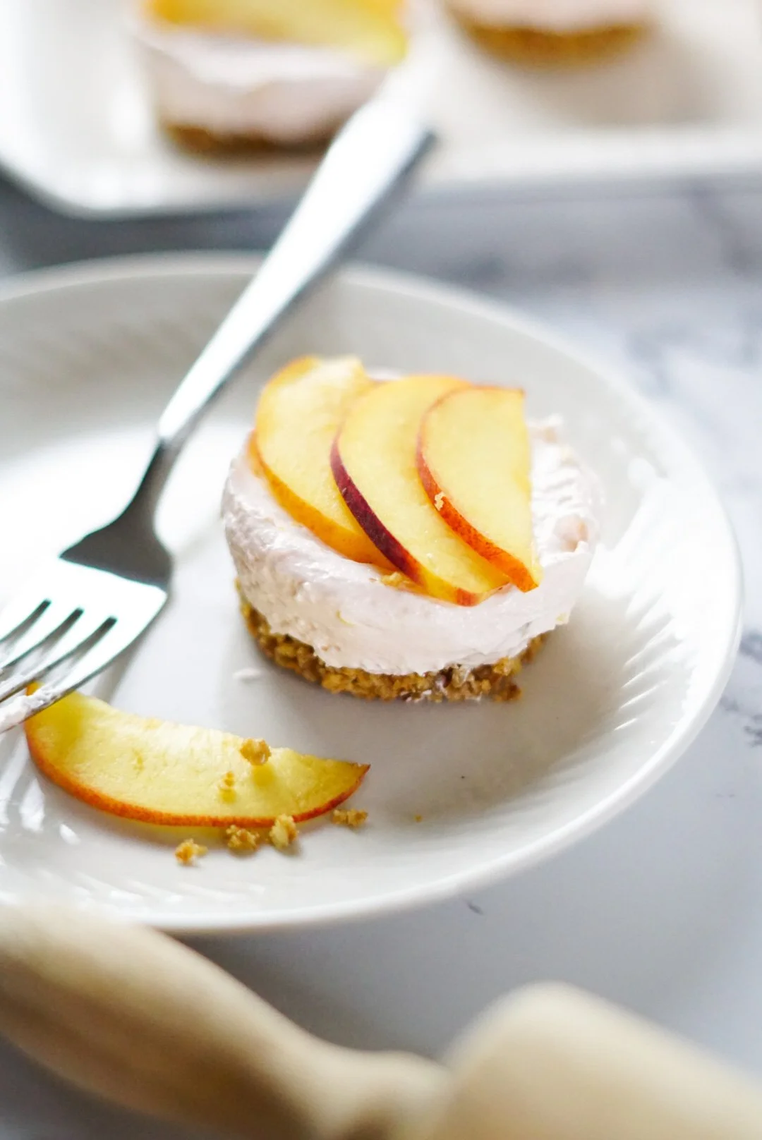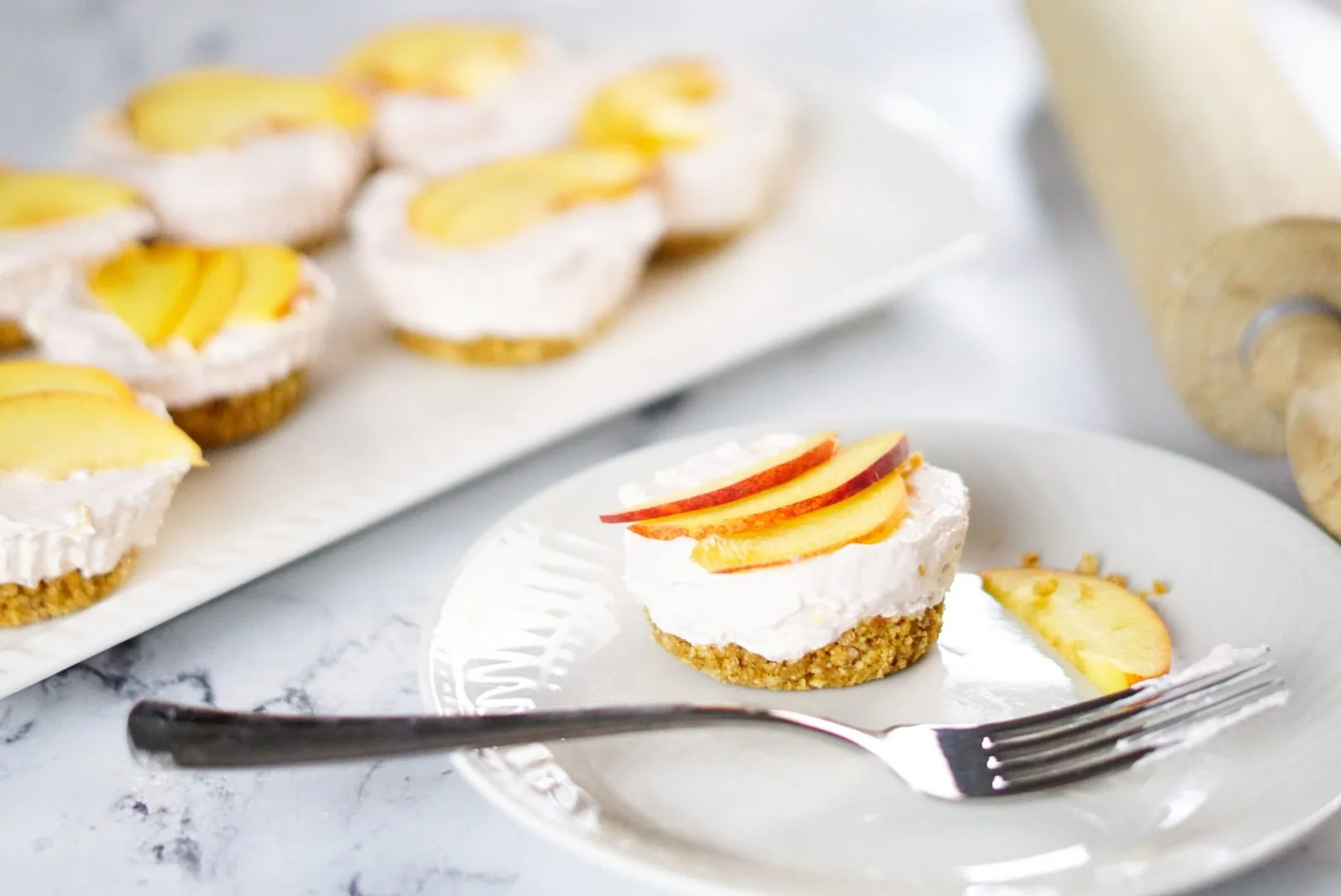 To get a firmer no bake peach dessert you can sit it in the freezer for 10 minutes and get a firm bite similar to that of a cheesecake that’s baked.